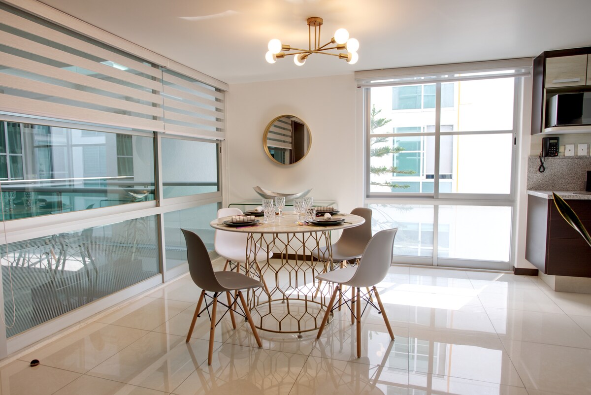 Disfruta de este maravilloso apartamento de 1 dormitorio: * Impresionante horizonte panorámico con vistas panorámicas * Único * Mejor ubicación en México. * Super seguro + Muchos restaurantes + cafeterías + tiendas y más * Los mejores servicios * Conserje las 24 horas del día, 7 días a la semana, en el vestíb * Wifi super rápido y muy confiable * Cómodo espacio de trabajo dedicado * Cocina totalmente equipada * Cama de dos plazas con colchón de espuma viscoelástica europea. * Bien pensado y espacio súper cómodo * Lleno de plantas * Esparce limpio y desinfectado * Espacioso * Lleno de magia
