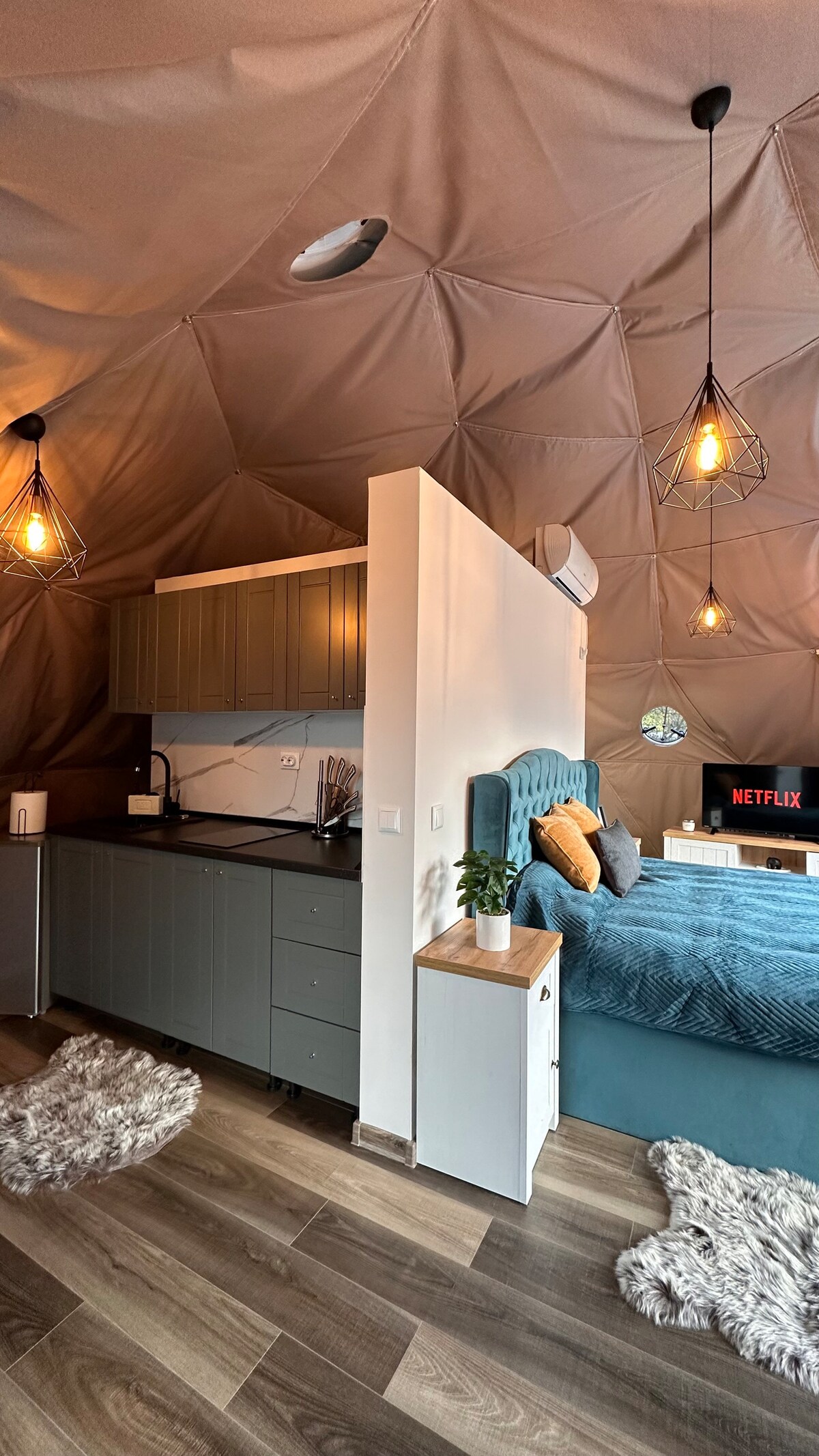 Skynest Dome- unul dintre cele mai romantice si mai luxoase dome-uri din Romania! Cada freestanding din dormitor e perfectă pentru clipe de relaxare în doi! În exterior pe terasa dome-ului te asteaptă un jacuzzi profesional să iti ofere momente pline de rasfăț sub cerul înstelat! Dome-ul dispune de baie privata si bucatarie în interior, TV, internet, Netflix iar in exterior iti poti pregăti mese delicioase în zona de barbeque! Vino si tu si încearcă o experiență inedita la Skynest Dome!