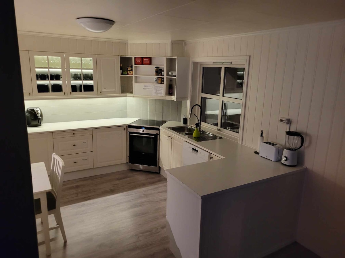 A welcoming guesthouse with three bedrooms, two living rooms and capacity for up to 12 guests. The house offers a fully equipped kitchen, bathroom, dining area, fireplace and Wi-Fi. Loft with bedrooms and living room with TV. Outside a spacious terrace, hot tub, grill area, big lawn, trampoline and beautiful views. Perfect for both families and groups all year round. There is also available toilet next door. Washing machine (NOK 100 per load). Electric car charging is NOK 200 per charge.