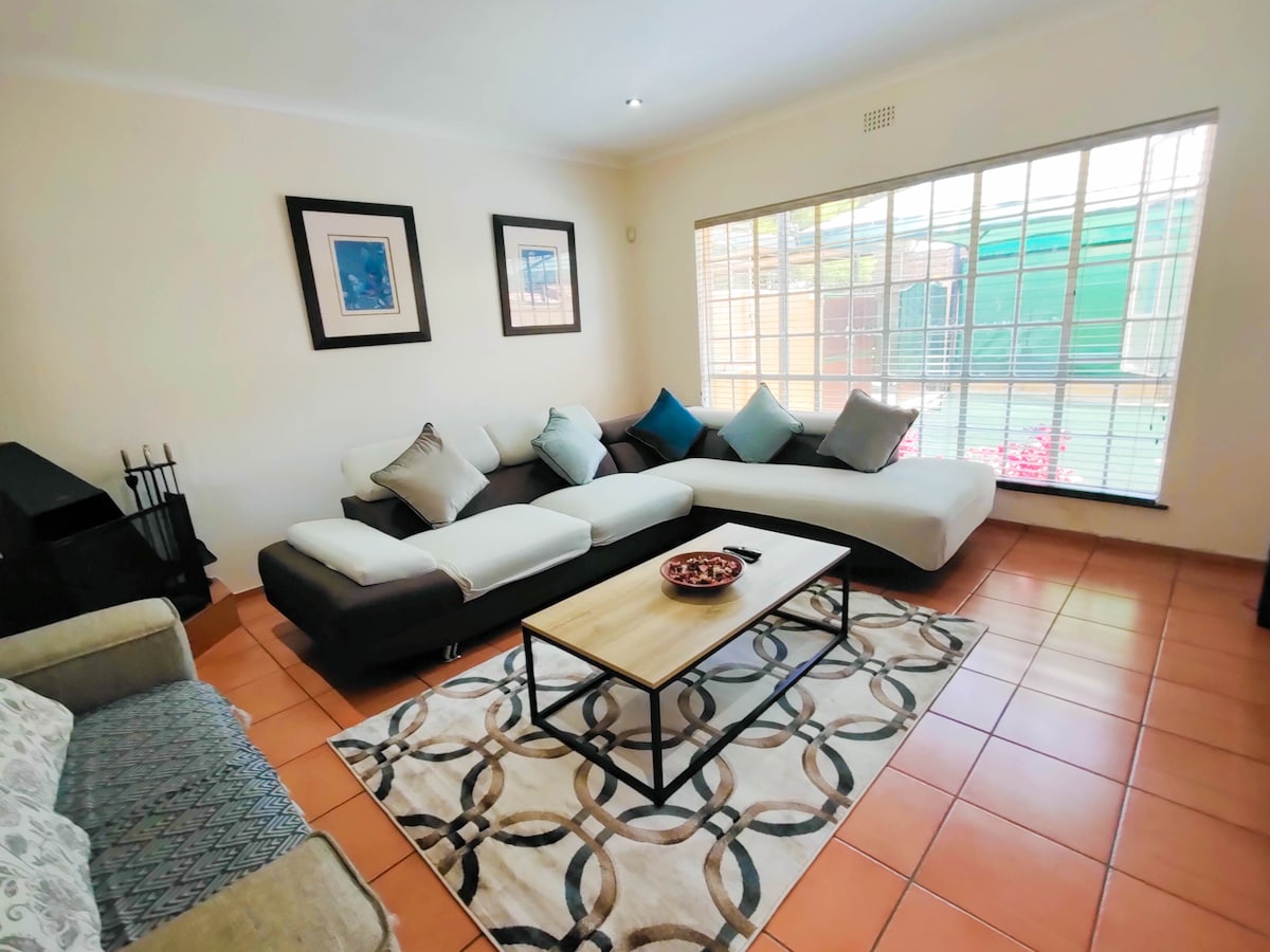 Ubicado en un callejón sin salida tranquilo y seguro. Zona de comedor y cocina totalmente equipada con fogones de gas. Acogedor salón con Smart TV, Showmax/Netflix/YT. Wifi gratuito, rápido y sin límites. 3 dormitorios en la planta superior, cada uno con un escritorio que se abre a una sala de estar. Dormitorio principal con cama tamaño king, baño completo propio, bañera de hidromasaje y balcón. Jardín privado amurallado con gran barbacoa de ladrillo y Lapa amueblada. Acceso a la puerta del parque. Lavadora, tendedero giratorio. Garaje individual. ¡Ideal para grupos, familias, estancias largas y cortas!
