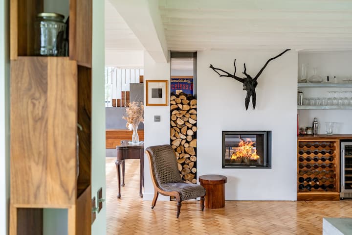 Hay una zona de estar a ambos lados de la chimenea central que alberga la estufa de leña con una combinación de opciones de asientos. Un televisor inteligente de pantalla ancha está a un lado de la habitación.
