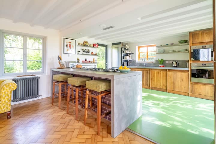 Accedido a través de una carretera sin hacer, y originalmente dos casas de campo victorianas tempranas, ahora Field Barn Cottage combina las dos con extensiones en cada extremo que complementan el conjunto. Más recientemente, la planta baja se abrió para crear un espacio de vida sociable contemporáneo de planta abierta y limpio y lleno de luz y fomentar la facilidad de movimiento. La esencia del granero es moderna, moderna y muy fresca: la cocina está hecha a mano, los pisos de madera recuperados y los muebles de diseño son del orden del día, destacados con obras de arte modernas y carteles de música repartidos por las paredes, tanto arriba como abajo. Una estufa de leña de doble cara ayuda a agregar calor adicional al espacio habitable, cuando es necesario. En un extremo del granero, un vestíbulo de entrada independiente donde se pueden dejar secar las chaquetas mojadas y las botas sucias y lavar la ropa, con una ducha adyacente estilo habitación húmeda a mano para lavar los cuerpos de arena y los dedos de los pies después de un día en la playa, o darse un chapuzón en el mar. Arriba, en el primer piso, encontrarás cinco dormitorios más tradicionalmente amueblados (tres dobles y dos individuales), todos disfrutando de colchones de calidad y bendecidos con ropa de cama fina. Si quieres alejarte de la multitud, encontrarás un espacio tranquilo en este nivel con asientos estilo cine y un televisor de pantalla ancha montado en la pared para su visualización opcional. Un baño con ducha inteligente y con azulejos y un baño con bañera con ducha de mano en este piso completan la escena.