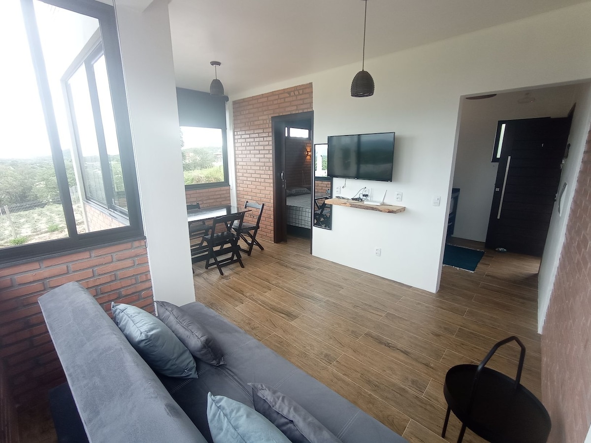 Amplio, cómodo, privado, acceso individual Ideal para parejas jóvenes o 4 personas, para vivir bien A 5 minutos de la playa en coche (2 km); a 1 km del centro. Ubicación tranquila, segura, fácil acceso a Rosa y otras playas de la zona. - Habitación con cama queen y aire acondicionado Q y F -Sala con TV 32 Smart, dos camas individuales, ventilador -Delicioso balcón con hamaca y hermosas vistas a las montañas -Cocina completa y funcional -Jardín y parrilla (uso común) - Wi-Fi estable de fibra de 100 MB