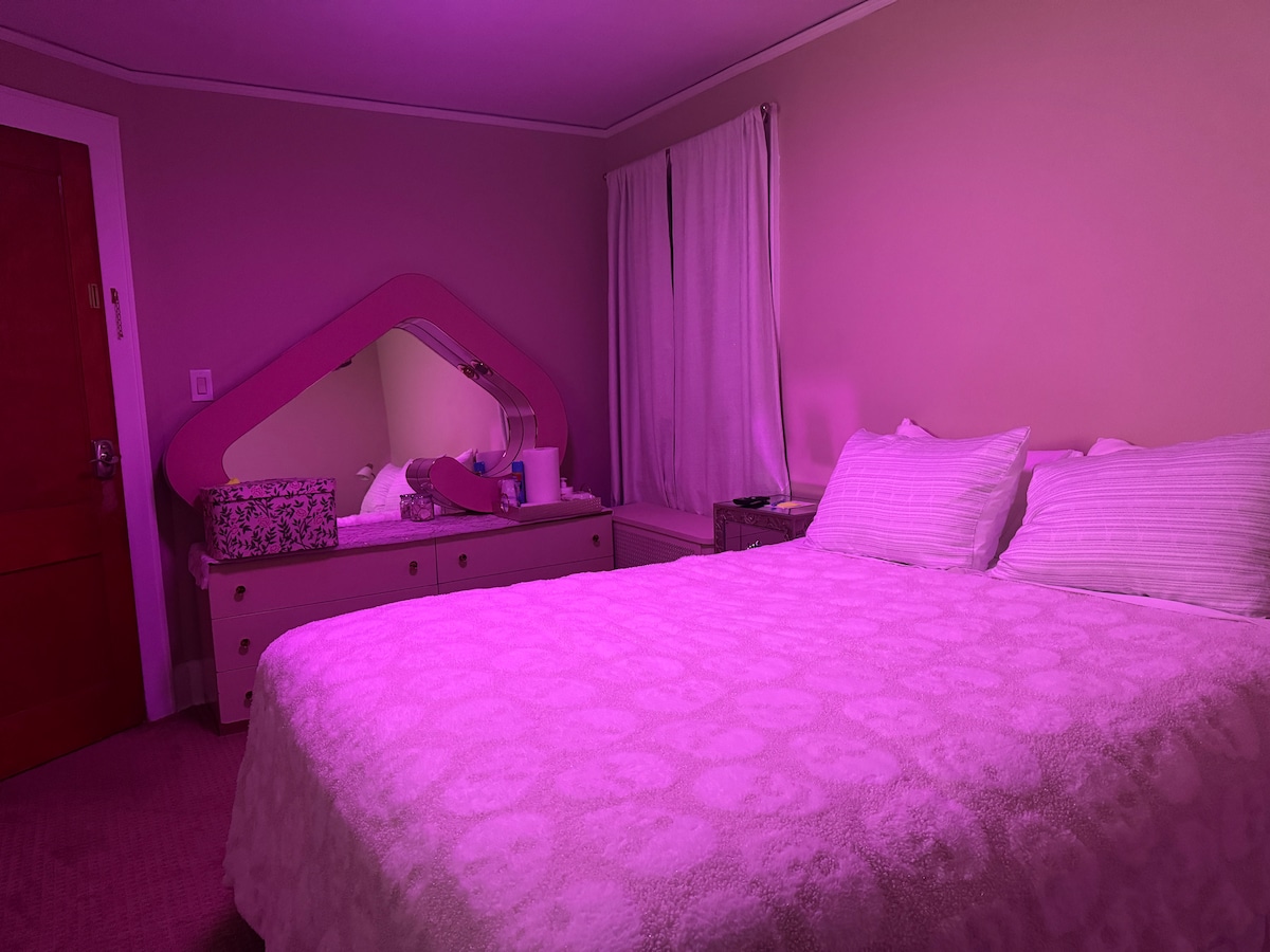 This meticulously curated Japandi-inspired studio is perfect for remote work or a peaceful retreat. The space features a cozy queen bed, small loveseat, and seating area. Enjoy high-speed internet, TV, and a writing desk for productivity. The suite includes a kitchenette with a fridge, microwave, and coffee maker. Located in a quiet, safe neighborhood, with access to a backyard fire pit for relaxation. Ideal for a calm, comfortable, and productive stay.