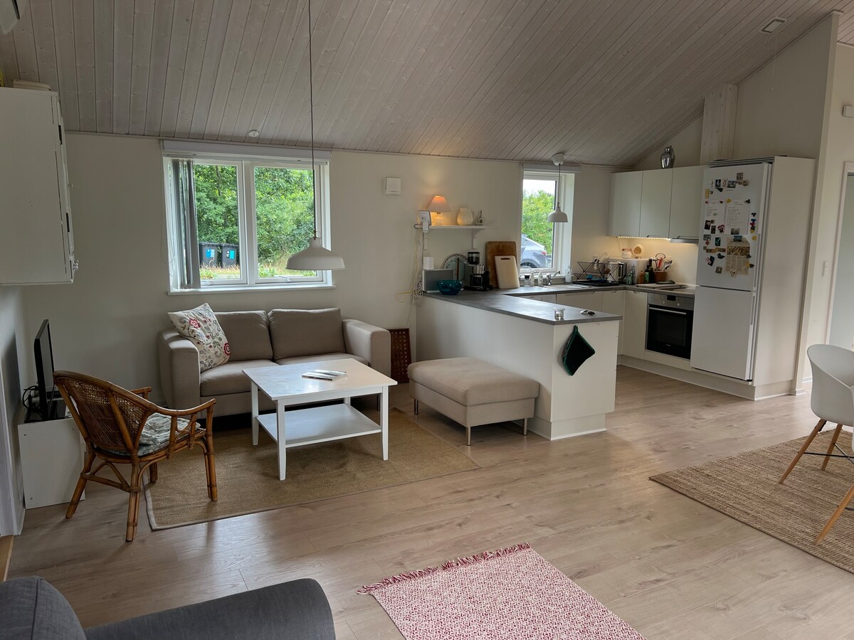 Hermosa cocina / sala de estar con luz fantástica, tanto por las ventanas de tragaluz como por la gran ventana que da a la terraza y al jardín. La cocina tiene una isla, estufa de leña y está en conexión abierta con el comedor, que a su vez está parcialmente abierto a la sala de estar. 2 habitaciones con altillo grande, baño grande con spa y ducha, así como lavandería con instalaciones de lavado. Hay 1000 m hasta la playa más cercana y 2 km hasta las tiendas más cercanas.