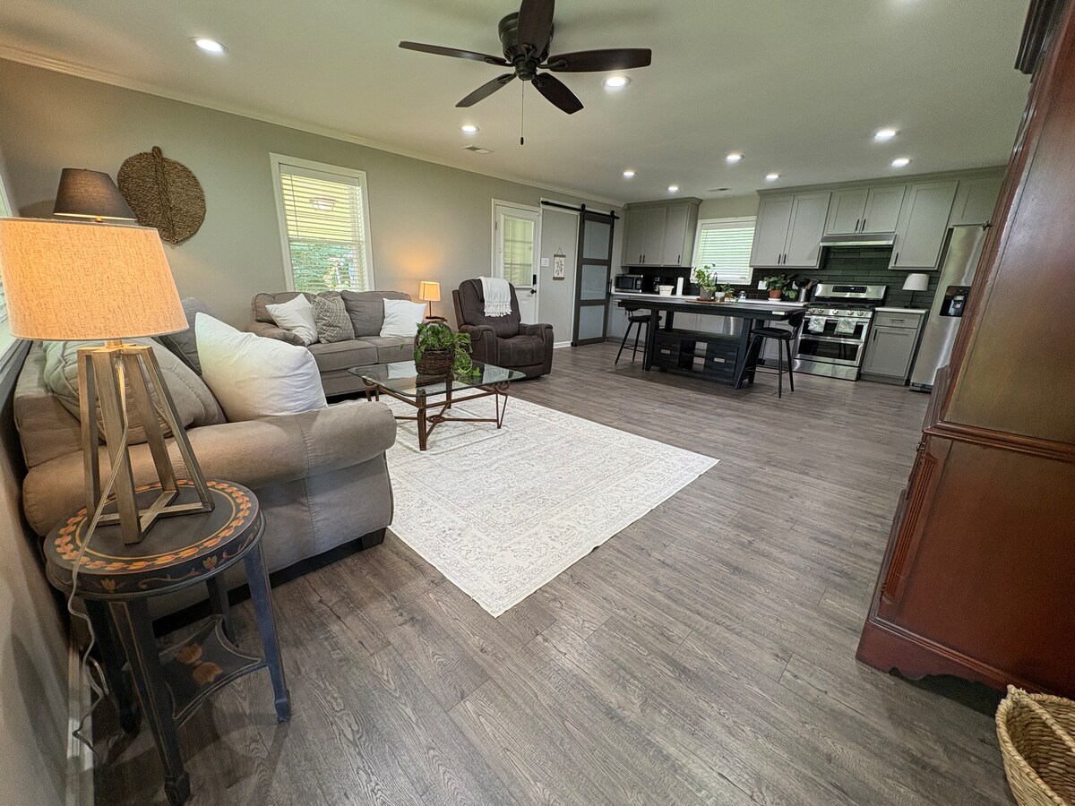 Entrada privada al aire libre. No hay acceso desde la casa principal al dúplex y viceversa. ¡Privado! Sin espacios compartidos, sin tarifas de limpieza ocultas. Este acogedor dúplex tiene una sala de estar con cocina (mininevera, microondas) y un baño y está unido a nuestra casa. Capacidad para 2 adultos y hasta 2 niños pequeños. No aceptamos huéspedes de Memphis y no creemos que nuestra propiedad sea adecuada para escapadas románticas, ya que vivimos al lado y tenemos niños y perros.
