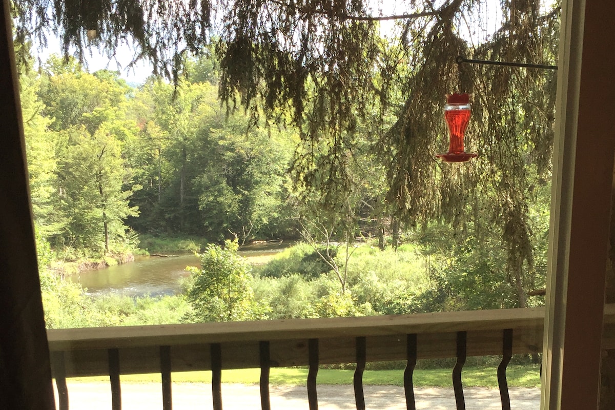 Pet friendly, air conditioned cabin with private fish pond (catch and release). Swimming is allowed (at your own risk). Miles of trails, and a million dollar view, total privacy, and glittering stars! Dark Sky area! Hiking, birding, x-country skiing, mt. biking. Near Genesee River. Fully furnished kitchen, deck with gas grill, H-Def TV/WiFi, campfire pit (wood provided). Sleeps eight. HUNTERS: 75 acres for deer & turkey hunting, 6 hunter max. Must sign waiver and check boundaries with us.
