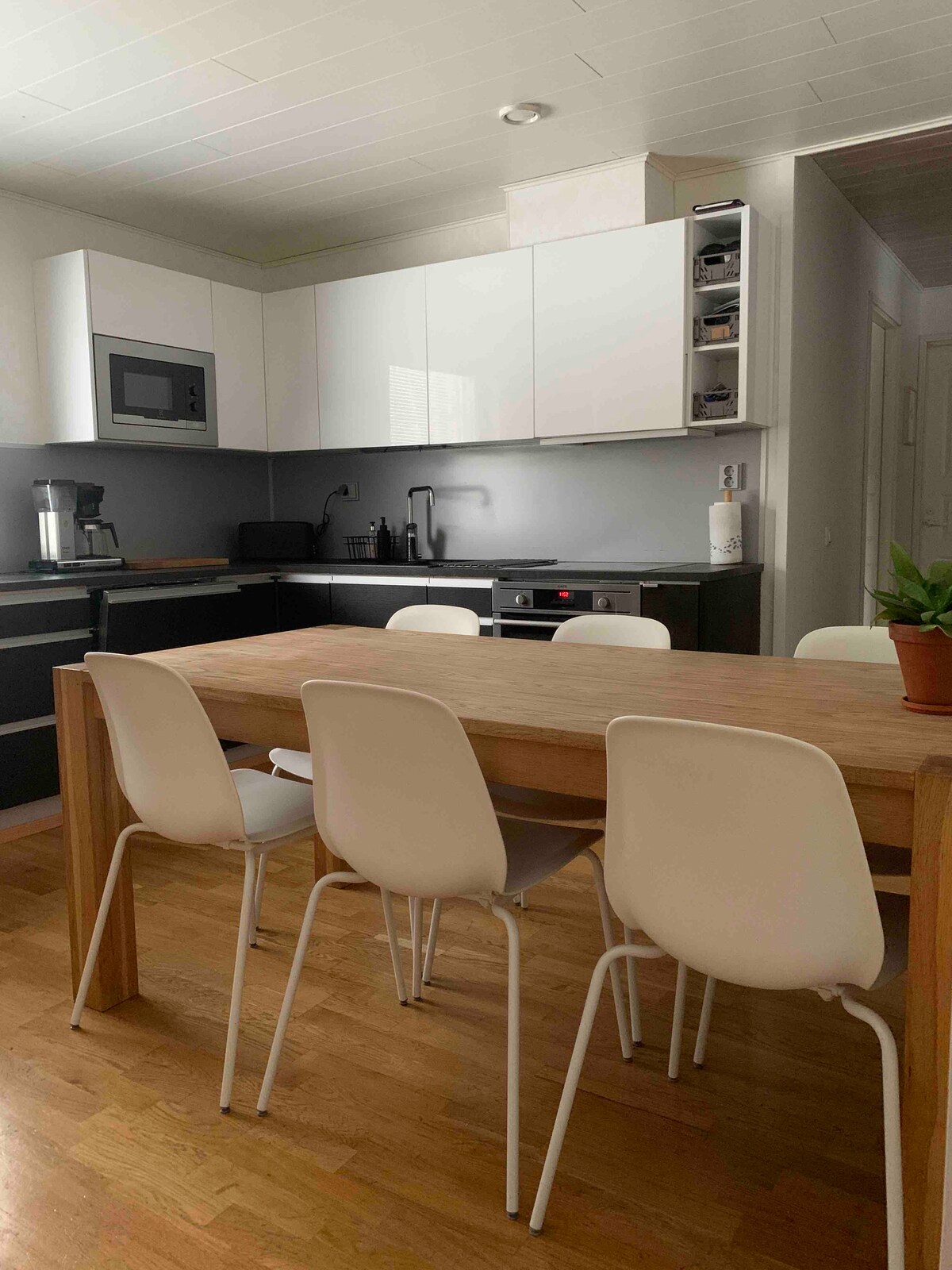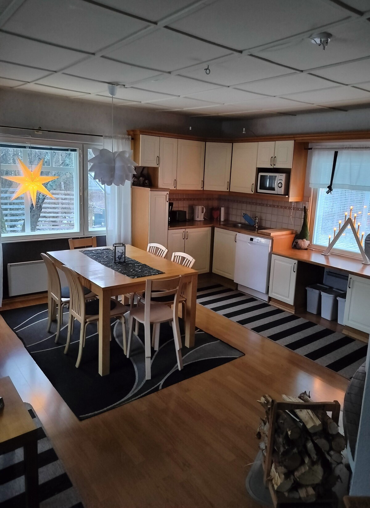 ¡Le damos la bienvenida a esta casa única de Laponia! Haremos que su estancia sea agradable y cómoda: contamos con aire acondicionado, un baño moderno con sauna y dos duchas, dos inodoros, calefacción por suelo radiante, una cocina de concepto abierto, grandes ventanales desde el suelo hasta el techo y 4 dormitorios. También puede usar nuestro gimnasio de forma gratuita. La casa se encuentra en un pequeño pueblo cerca de un hermoso bosque.