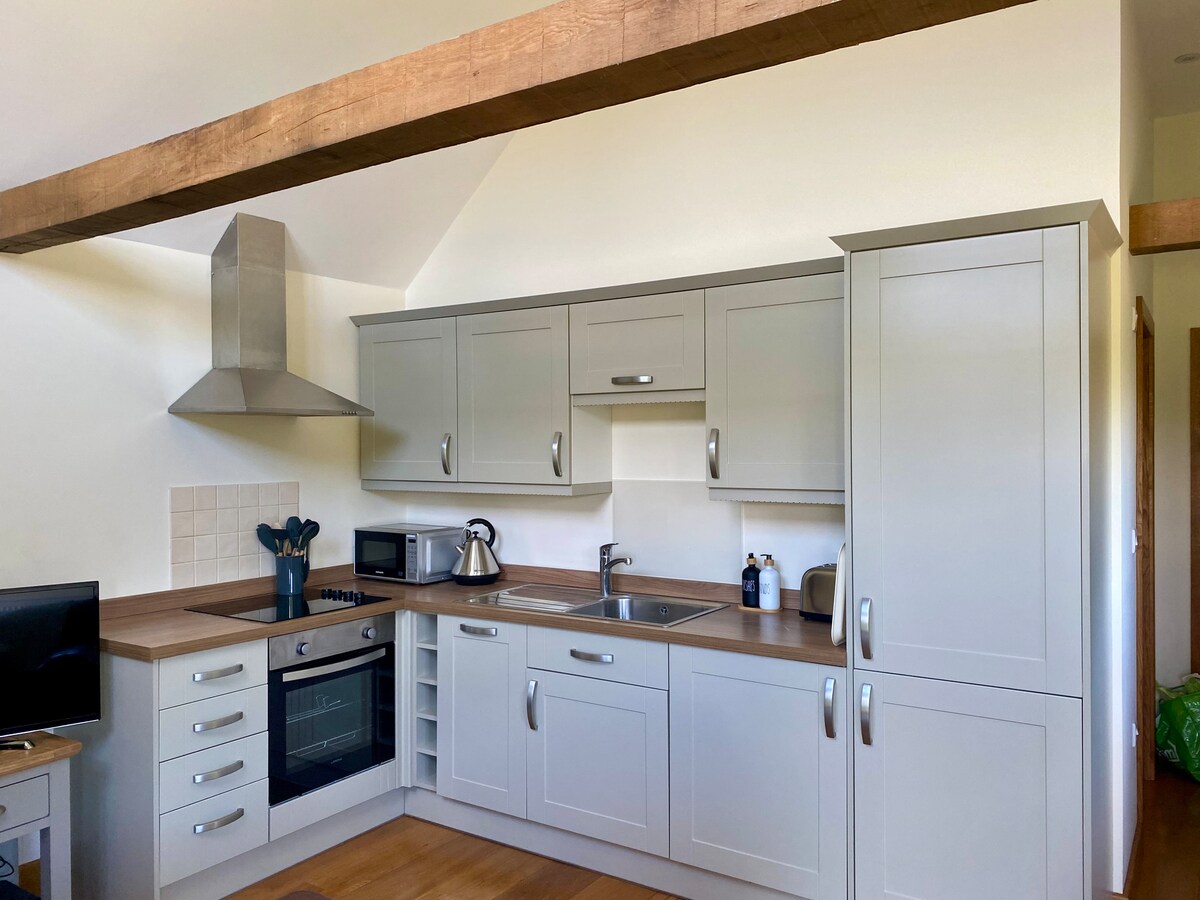 Un hermoso edificio con estructura de roble y excelentes vistas a los South Downs. Alojamiento que consta de un cómodo salón con TV, wifi y estufa de leña. La cocina está bien equipada con lavavajillas, horno y microondas. Un dormitorio doble en la planta baja con baño con ducha. Arriba hay un altillo con dos camas individuales y una sala de estar sobre el salón con un baño con bañera independiente. El espacio exterior es un patio orientado al sur con mesa y sillas y una barbacoa disponible.