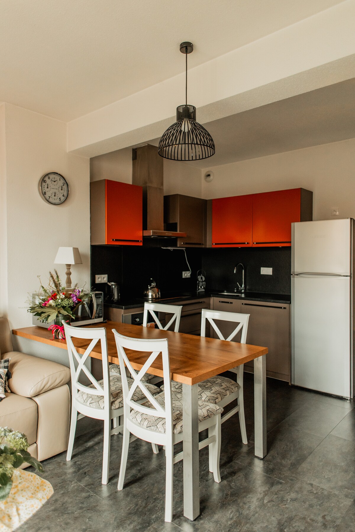 Cozy, friendly, and very bright apartment with a bedroom for two people and a spacious living/dining/kitchen area near the EP Park, which is about 4 km away. The modern, newly built bathroom features a large double vanity and a spacious walk-in shower. The fully equipped kitchen also includes spices, oil, and vinegar. The adjoining open-plan living area offers plenty of space in a cozy atmosphere. TV and fast Wi-Fi are included!