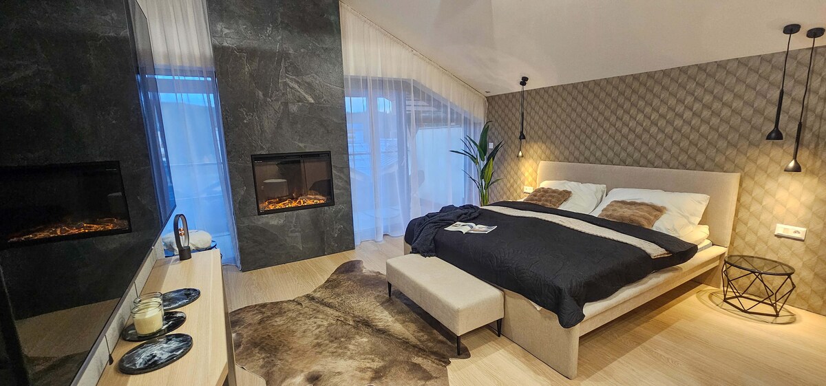 Unique chalet with private wellness zone—with jacuzzi, infrared sauna, and relaxed zone with stars and sky. Four bedrooms with four toilets. Garage with ping pong and darts. Fully equipped kitchen and big living room with electric fireplace and SMART TV with Netflix. Special kids room with balcony, Xbox, toys, and books. This chalet is situated in the centre, so you can enjoy nature by walk. But in case of need, it is close to shops, restaurants, and services. Welcome drink as a gift.