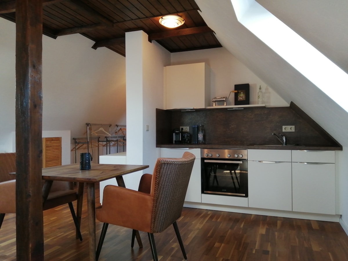 Hermoso apartamento de 45 metros cuadrados en la azotea totalmente amueblado en el borde del Dölauer Heide en el verde y tranquilo distrito de Halle-Dölau. El apartamento está situado en el segundo piso / ático de nuestra hermosa villa histórica de 1904. El departamento tiene capacidad para 2 adultos y un máximo de 2 niños. El departamento tiene un baño grande con ducha, una sala de estar y dormitorio con cocina abierta y comedor. La cocina equipada es nueva y está totalmente equipada.