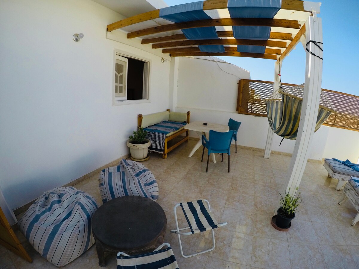 Disfruta de una increíble vista al mar Rojo desde tu apartamento en la azotea de un dormitorio con una cocina equipada, comedor y terraza privada para los amaneceres. Tendrás total privacidad para usar el departamento, incluida una terraza privada con vistas al mar. La única zona compartida son las escaleras. Puedes ir y venir del edificio cuando quieras