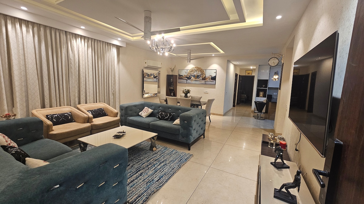 Ubicado en Falcon View, Mohali, este espacioso 3 BHK ofrece una sensación hogareña. Disfruta de una vida de lujo en este piso de 3 dormitorios totalmente amueblado en Mohali. Ideal para estancias largas, cuenta con interiores elegantes, wifi de alta velocidad, televisores inteligentes, una cocina completa y aparcamiento privado. Disfruta de acceso a las instalaciones de la casa club, como un gimnasio, una cafetería, un minimercado y una zona de juegos para niños. Perfecto para viajeros de negocios y familias. Cerca del aeropuerto de Chandigarh, el hospital Fortis y los centros de TI.
