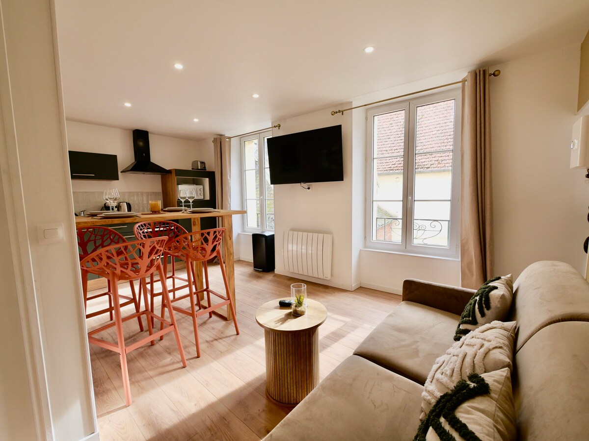 Tu historia en la Historia. Venga a alojarse en el segundo piso de la mansión en un elegante apartamento de 65m2. Este apartamento tiene una vista clara de la campiña circundante, su decoración refinada invita a la calma y al descanso. La sala de estar ofrece un cómodo salón y una mesa de comedor, la cocina está equipada, el baño espacioso y agradable. Hay dos habitaciones, cada una equipada con una cama tamaño queen de calidad hotelera.