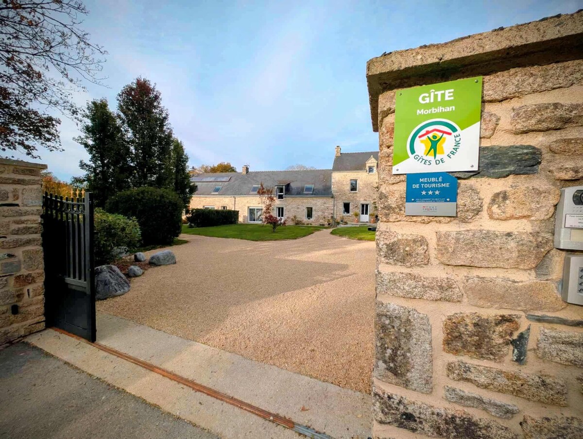 El Manoir du Vau d'Arz, antigua casa solariega del siglo XVI a los pies de Rochefort-en-Terre (Morbihan), el pueblo favorito de Francia, se encuentra en 2 hectáreas de parque clasificado Natura 2000, donde desemboca el río Arz. La luminosa y frondosa casa rural Brocéliande domina el patio cuadrado del Manoir y su piscina climatizada a 28°. Sábanas, toallas y limpieza incluidas. Alquileres de sábado a sábado en julio y agosto. De septiembre a junio, 2 días mínimo Cesta de desayuno disponible