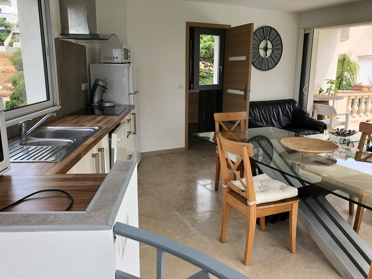 Venga a relajarse en un entorno tranquilo con vistas al mar. El mar está a 250 metros. Tiendas y mercado a pie. Estudio amueblado con buen gusto, con todas las comodidades. Sofá cama de 140 cm con sistema «rapido» y cama plegable de 90 cm (1 persona). Cocina equipada con isla central, horno, microondas, placa de inducción de 3 fuegos, nevera con congelador, cafetera expreso de granos, ventilador de techo, TV conectada, armario vestidor, lavadora, cuarto de baño, secador de pelo, vaporizador. Terraza equipada con una mesa 4 sillas, toldo.