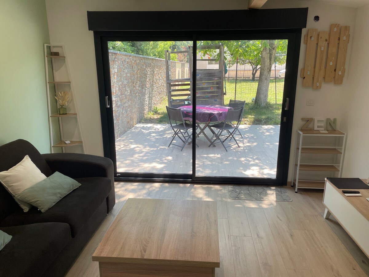 Gran estudio de 38 m² en Genas. Sector Vurey. Frente al parque del castillo de Veynes (5 ha de bosque, parque de patinaje, parque de bicicletas, juegos para niños, ...) y a 5 minutos del centro de Genas. Cerca del aeropuerto Saint Exupery, Groupama Stadium/LDLC Arena y Eurexpo. Apartamento compuesto por una cama de 2 plazas y un sofá cama. Cocina totalmente equipada. Pequeña mesa exterior para 2 personas. Wifi/Aire acondicionado/Smart TV La limpieza debe realizarla usted. Ofrecemos un paquete de limpieza por 30 €.