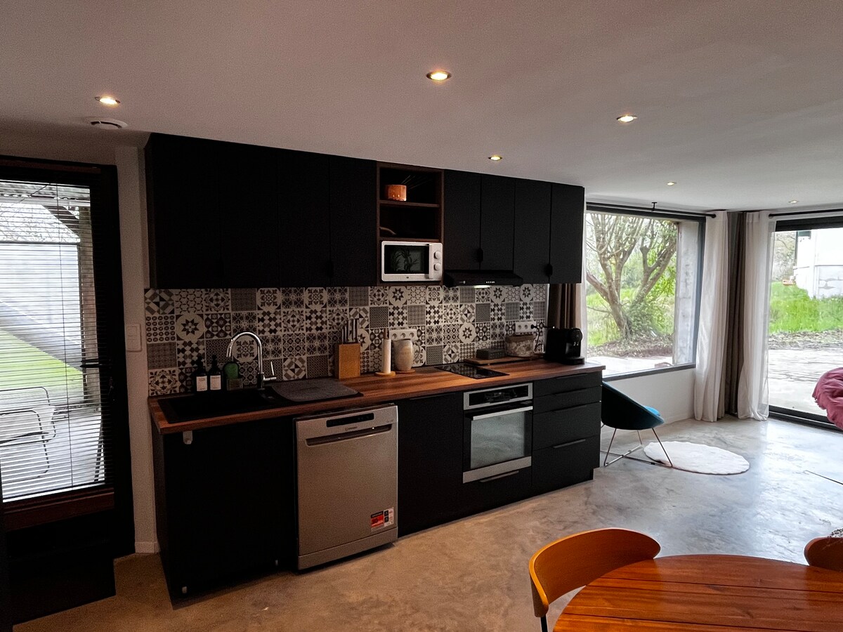 Este estudio de 25 m² se encuentra en el municipio de Saint Étienne d'Orthe, con menos de 1000 habitantes, cerca de todas las comodidades y tranquilo. A unos 30 minutos de Bayona, a 20 minutos de las playas, a 45 minutos de Pau. Está adosado a nuestra casa. Sin embargo, aparte del camino de entrada principal común, este estudio tiene una plaza de aparcamiento privado y goza de una independencia total: acceso privado, jardín y terraza privados también, sin vecinos.