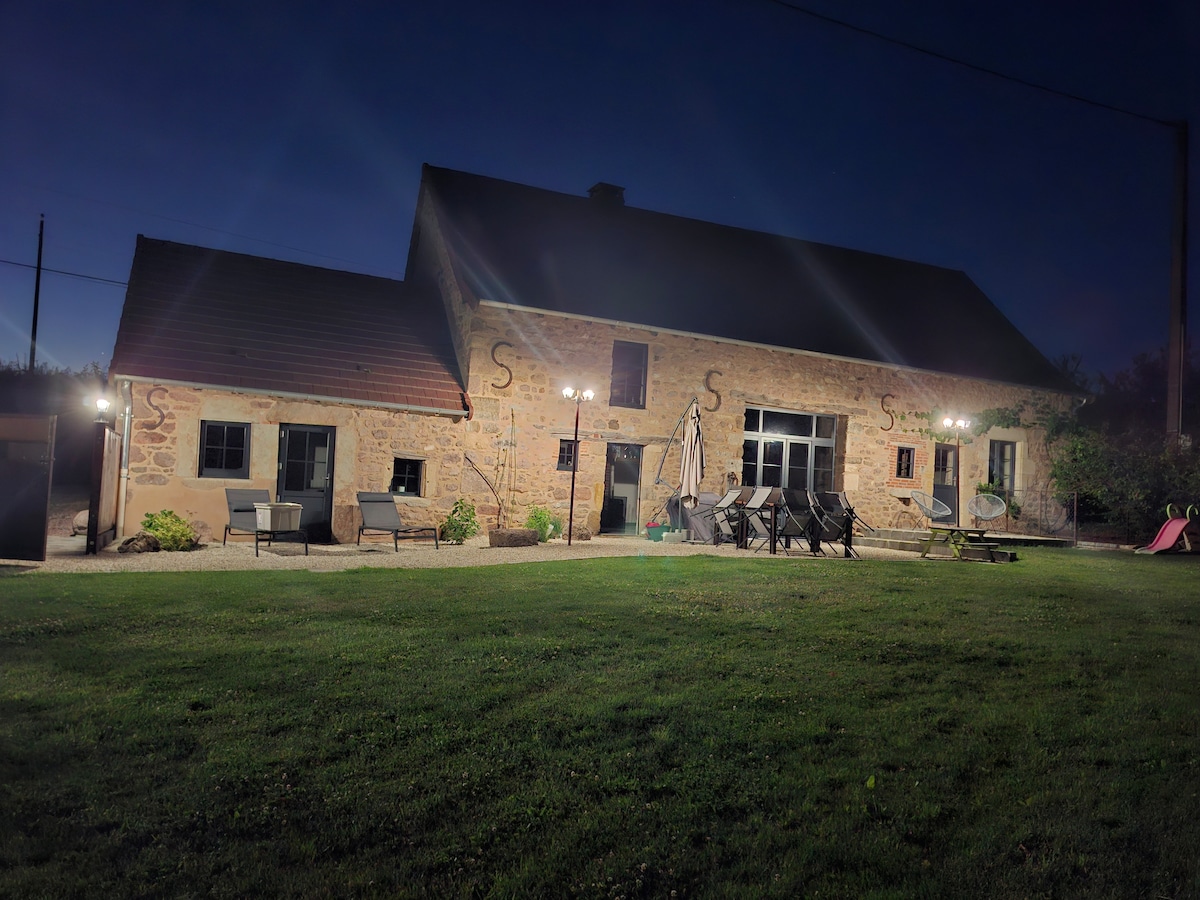 Bonita casa familiar, ideal para compartir buenos momentos con amigos o familia. Habitación muy grande con chimenea, equipada para comidas grandes. Zonas de juegos para los más pequeños, futbolín y juegos de madera 2 habitaciones y un dormitorio arriba para descansar 3 duchas están disponibles El parque cuenta con una cancha de petanca y una gran zona de juegos para niños. Posibilidad de agradables paseos por los bosques alrededor de la casa (caballo, bicicleta de montaña). Posible + 2 viajeros