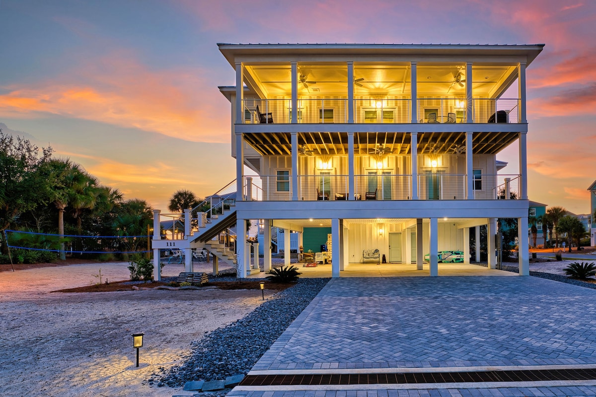 Welcome to this stunning brand-new 5 bedroom, 4 bathroom, 2400-square-foot coastal retreat located on beautiful Cape San Blas. This home is the ideal escape for families, groups, and beach lovers. Ideally positioned with the serene bay to your left and the Gulf’s sparkling shoreline to your right, guests can enjoy the best of both worlds. The beach is just a short drive away, making it easy to slip away for morning walks, afternoon swims, or unforgettable sunsets.