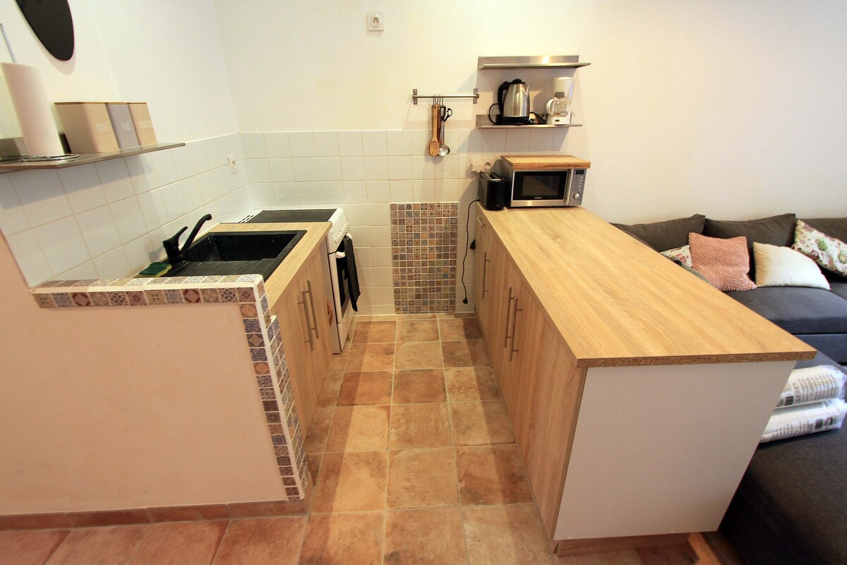 estudio en la planta superior, renovado y con aire acondicionado,zona de dormitorio con cama doble, sala de estar con sofá cama BZ , TV , cocina equipada ( placa de cocción , horno , microondas, nevera-congelador, Nespresso ...), cuarto de baño con inodoro, lavadora , aspiradora… Vivienda para no fumadores, no se admiten mascotas El alojamiento tiene una escalera no segura, por lo que no es adecuado para niños pequeños , no hay equipo para bebés . El apartamento está configurado para alojar a 3 personas como máximo, incluidos niños.