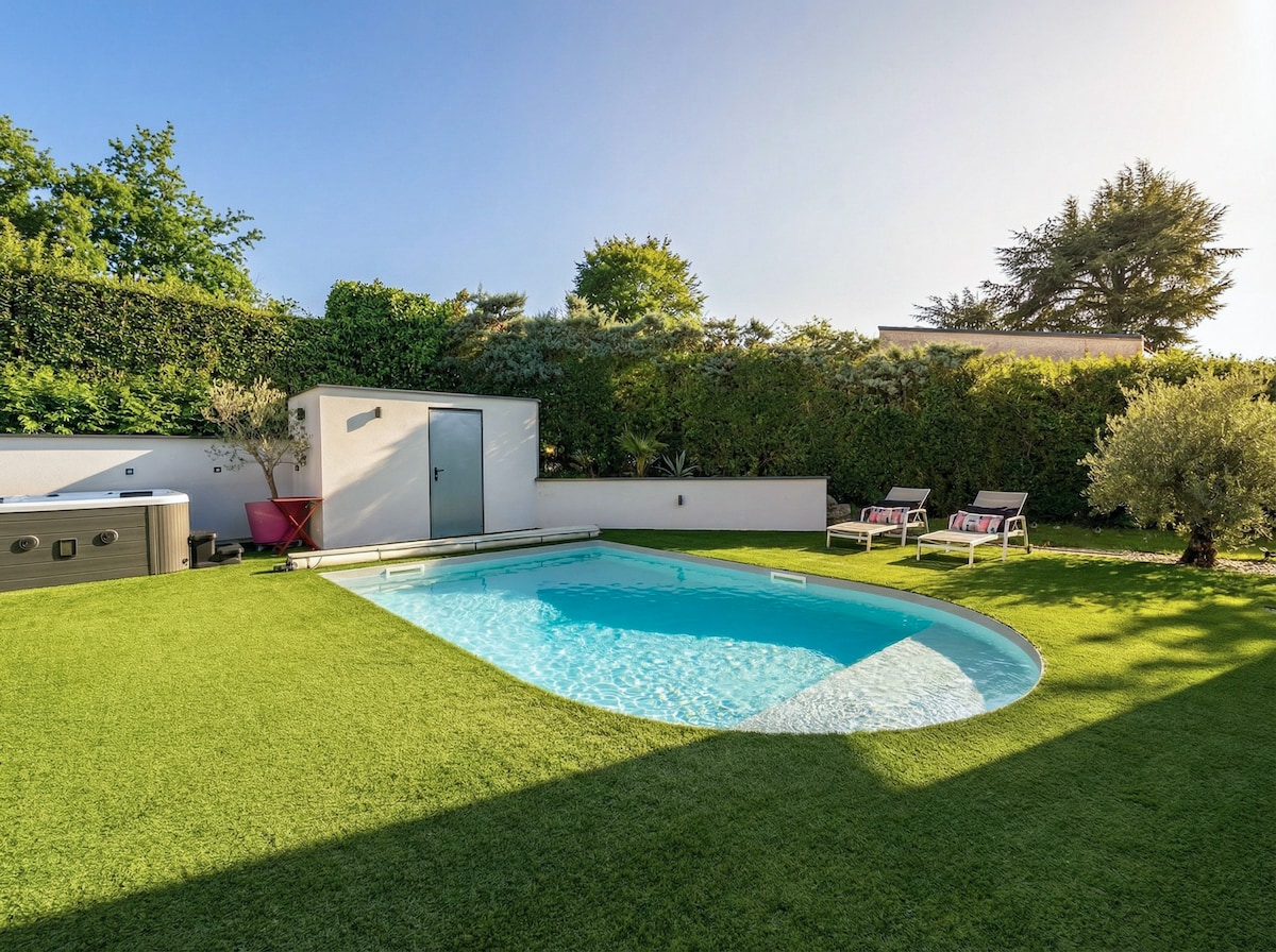 Acogedor estudio nuevo y funcional de 35 m² situado en la planta baja de una casa con entrada independiente y acceso directo a un gran jardín compartido con piscina de 6,50 x 3,50. Cama king size (+cama supletoria bajo petición), cuarto de baño, aseo, vestidor, pequeña sala de estar, cocina, cafetera, nevera, microondas, horno, placa de inducción, lavavajillas, TV, wifi. compromiso ideal entre paseos por la montaña y salidas por la ciudad. Grenoble 13 km, lagos Laffrey 7 km, Chamrousse 30 km Vizille Château 3 km