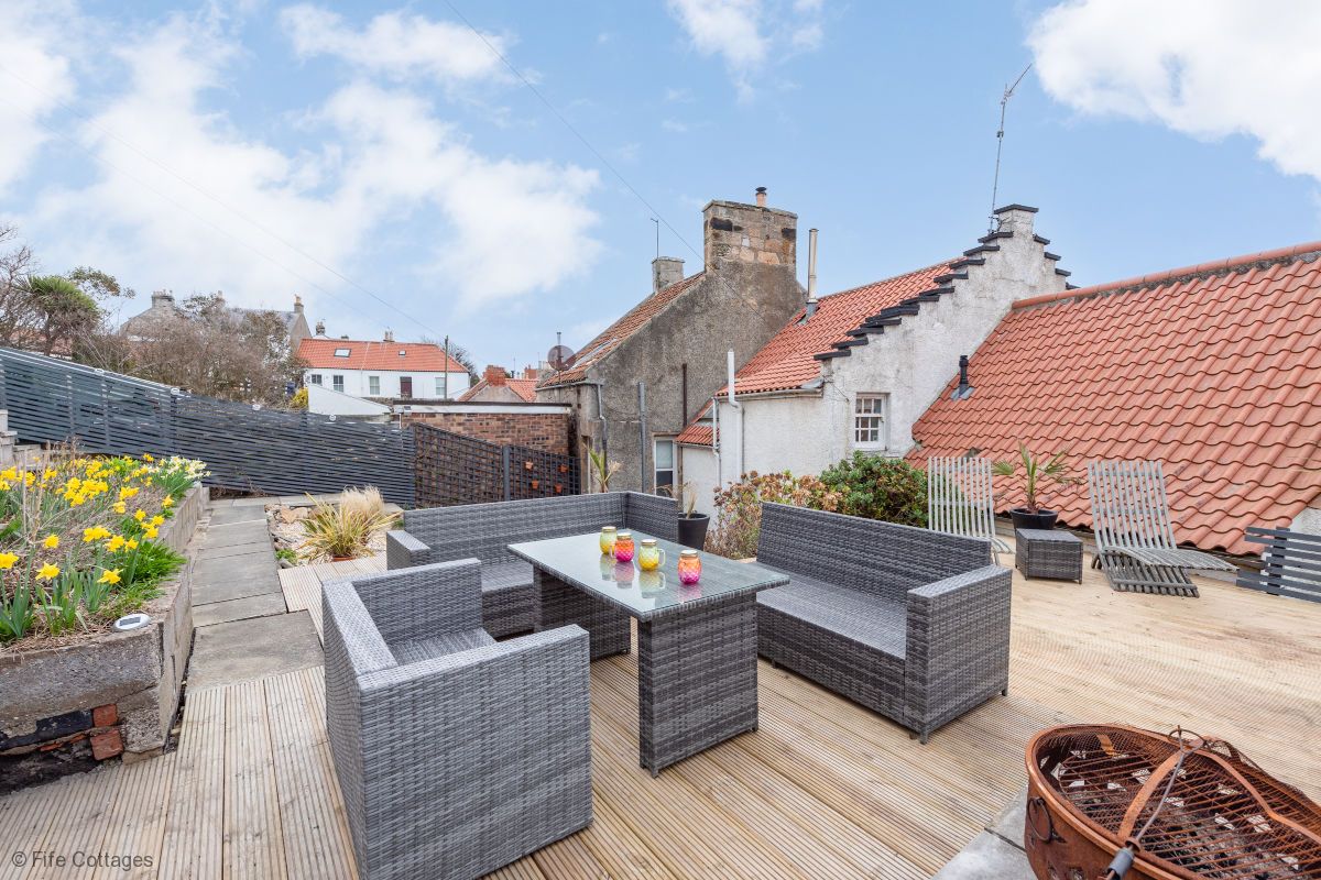 El paseo marítimo está a solo unos pasos del camino costero. En la planta baja hay una cocina con cocina que conduce al invernadero/comedor a un lado, cuarto de servicio y inodoro/ducha en el otro. El salón/comedor es amplio e luminoso, con magníficas vistas al mar y una acogedora estufa de leña, un baño y un pasillo. Arriba, hay un doble en suite con impresionantes vistas al mar sobre el Firth of Forth y una habitación doble. Un pequeño jardín junto al mar con asientos y un patio en la parte trasera. A 20 minutos en coche de St. Andrewws.