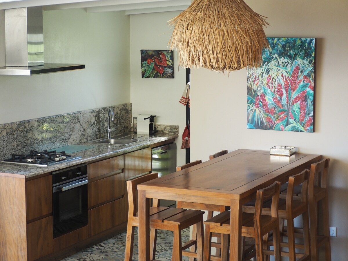 ¡Venga a descubrir un lugar espacioso y relajante! Su suite consta de un dormitorio, un baño y una sala de estar con cocina. Tiene acceso directo a la piscina compartida con vistas al océano Índico. Entrada privada. En la planta baja de nuestra casa familiar, es posible que le lleguen carcajadas o voces. Piscina reservada para la familia 30 minutos al día. Aeropuerto a 30 min, playas a 40 min, circos de 1 a 2 h. Golf, restaurantes, supermercado, farmacia, tienda de primicias, pescadería, iglesia y parque a 5 minutos.