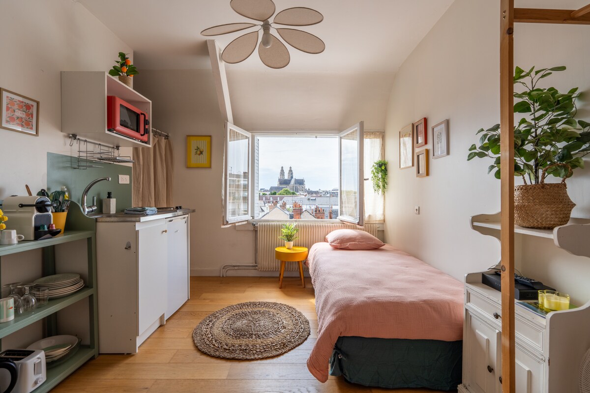 Studio refait à neuf centre historique de Tours linge de maison compris.m et une climatisation. permettant l'accueil de deux voyageurs entièrement décoré aménagé et refait à neuf dans un bel immeuble ancien en plein coeur historique de Tours. L'appartement dispose d'une vue incroyable sur la Basilique St Martin. Vous profiterez de tout le confort de la modernité, (un canapé convertible, cuisine équipée, Nespresso, douche et linge de lit et de toilette fourni, grande télévision).
