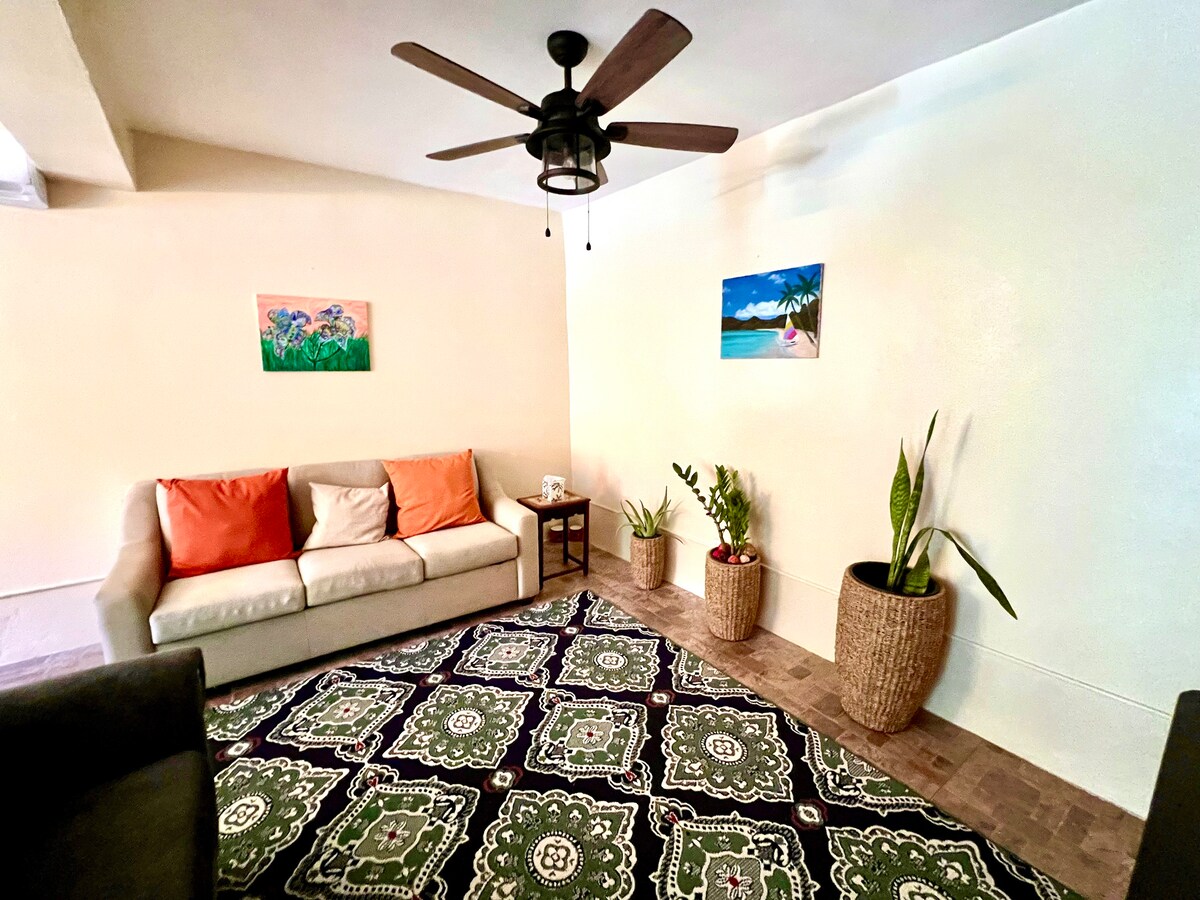 Bienvenido a tu escapada al paraíso tropical. Tu apartamento de 1 dormitorio y 1 baño frente a la playa ofrece el refugio perfecto para tus vacaciones. Situado en el extremo este de St Thomas, a un paso de la vibrante Margaritaville y la impresionante playa de Coki, tendrás lo mejor de ambos mundos: comodidad y relajación. La energía solar está conectada a la casa. El espacio con aire acondicionado cuenta con una lujosa cama tamaño king que te promete una noche de sueño reparador después de un día de tomar el sol de la isla. ☀️