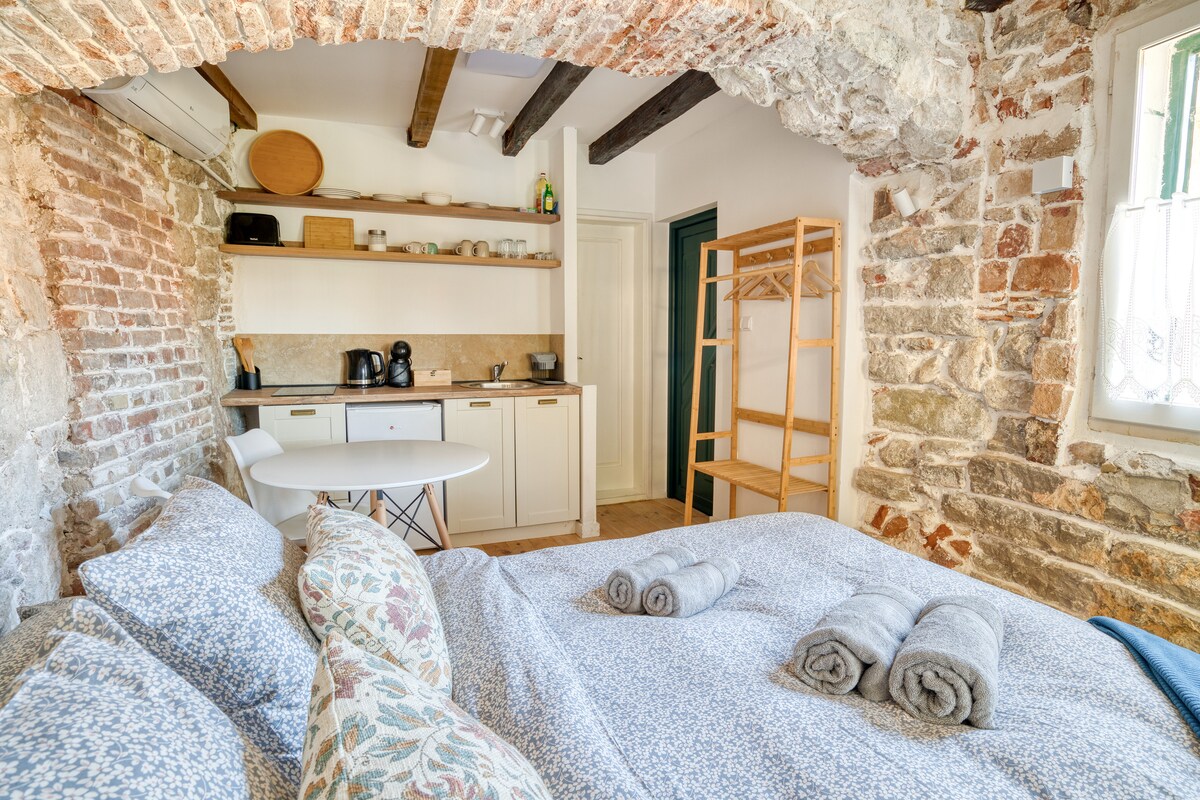 Justo en medio del patrimonio mundial del casco antiguo de Kotor, sube 54 escalones hasta este increíble estudio con jardín privado y terraza con impresionantes vistas a los tejados, las montañas circundantes y el mar. Todas las paredes son de piedra expuesta o roca cuidadosamente restauradas. La cocina está bien equipada y la decoración es moderna, luminosa y cómoda. Lo antiguo y lo nuevo.