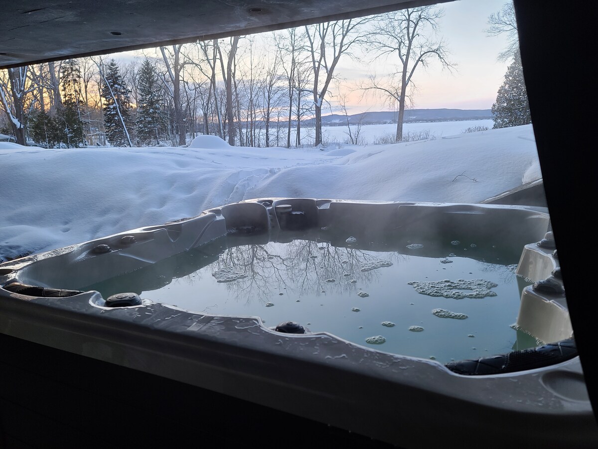 Escápate a nuestro sereno refugio en Airbnb con spa privado, piscina e impresionantes vistas al atardecer. Descubre la elegancia moderna, una cocina totalmente equipada y una acogedora cama tamaño king en el dormitorio principal. Mantente conectado con internet rápido y disfruta de un televisor en cada habitación. Trabaja cómodamente en el espacio de trabajo dedicado. Relájate en la sala de estar adornada con plantas vibrantes, incluido un hermoso árbol de Scheflera. Con la cercana playa de Oka y el fácil acceso a Montreal, experimenta la tranquilidad, la aventura y la belleza de la naturaleza.