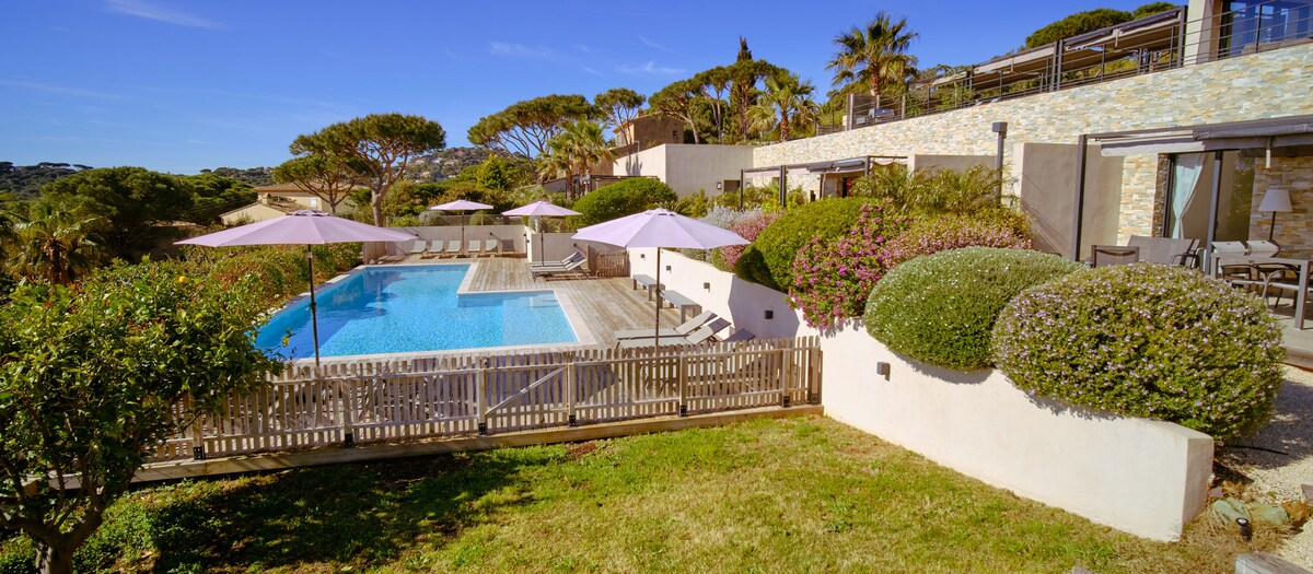 In the Gulf of Saint-Tropez, in Sainte-Maxime, a private property hosts four exclusive, fully air-conditioned lodges enjoying panoramic sea views in a peaceful residential setting. Located on garden level, each lodge opens onto a wooden terrace facing the Mediterranean and shares access to a heated 14-metre swimming pool, just 400 metres from the beaches. Clean lines, modern comfort and understated elegance create a serene and welcoming environment for a refined stay on the French Riviera.