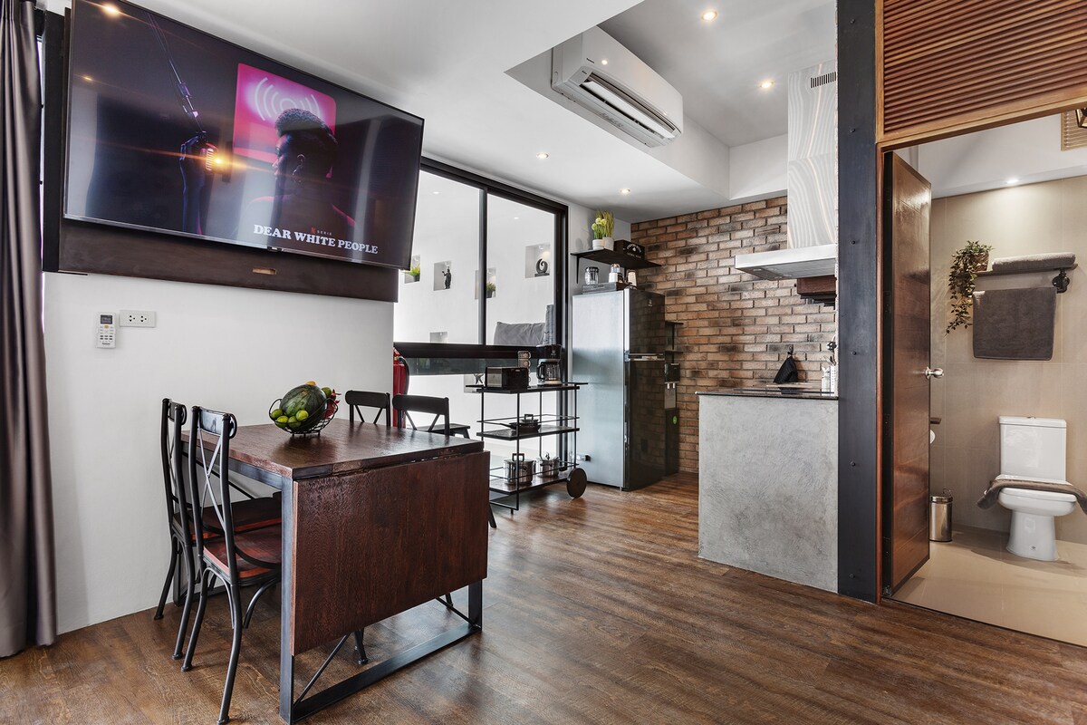 This compact and fully equipped studio apartment features a King size soft bed & a sofa bed (150cm wide) allowing it to accommodate up to 4 people comfortably. It features a fully equipped kitchen, dedicated work desk with ergonomic chair, cozy lounge with sofa chairs, and a 50-inch Smart TV. Enjoy modern comforts like air conditioning, hot water, and high-speed Wi-Fi, plus access to Villa Lila’s pool & gym!