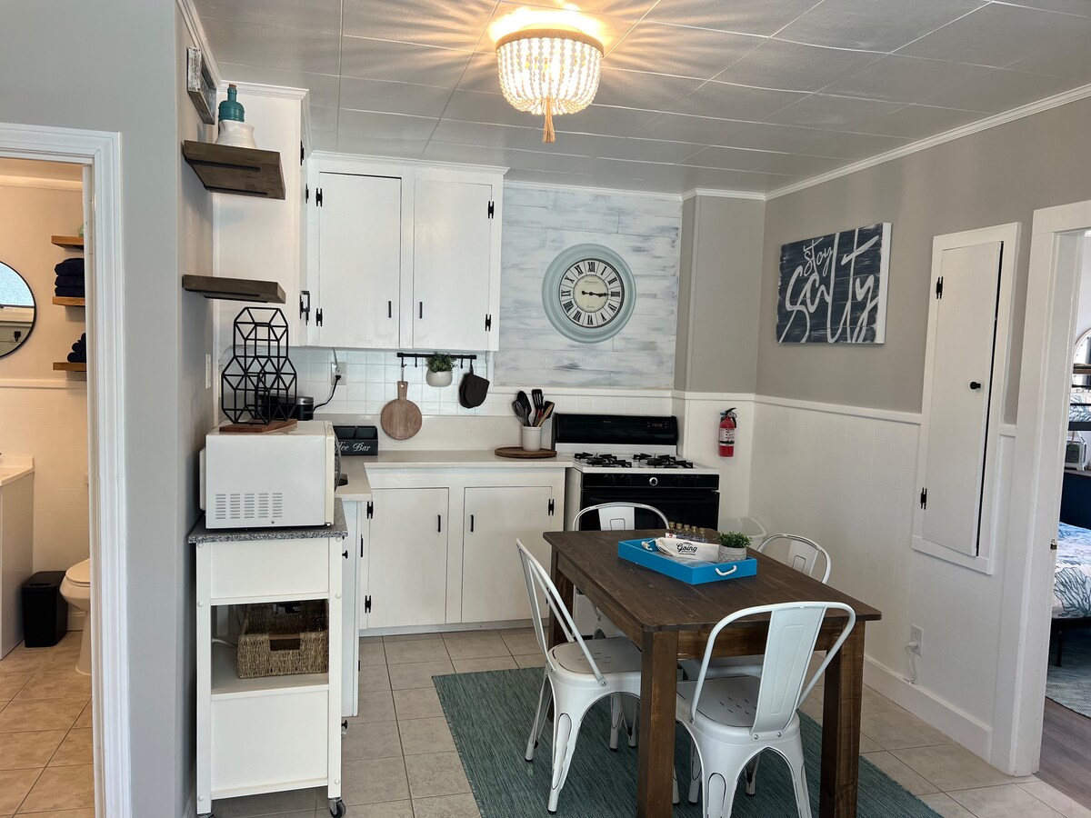 Your family will be close to everything when you stay at this centrally-located Antique New England getaway . Recently renovated, but tastefully original. Everything you need is within walking distance; shopping, grocery, dining, lake, short drive/ride to beach. The space is about 900sqft; 1 bathroom, king bedroom, queen bedroom, queen pull-out couch, and an additional room in which a twin bed can be put (upon request). It will comfortably hold 4 adults, but will accommodate up to 7.