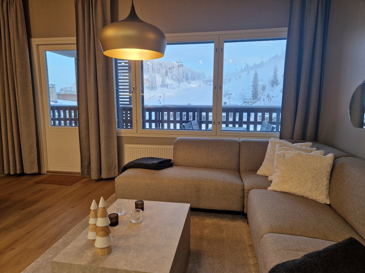 Lumi Chalet es un apartamento de esquina de alta calidad y excepcionalmente bueno justo en el corazón del pueblo de Ruka, justo al lado de las pistas delanteras. El departamento se renovó y decoró con un alto nivel en otoño de 2024: todas las superficies, muebles y camas son nuevos. Desde aquí se puede llegar directamente a las pistas, senderos, restaurantes, tiendas y servicios sin coche. El espacioso apartamento de tres dormitorios ofrece impresionantes vistas del pueblo y las montañas, una ubicación que no se puede superar en Ruka.