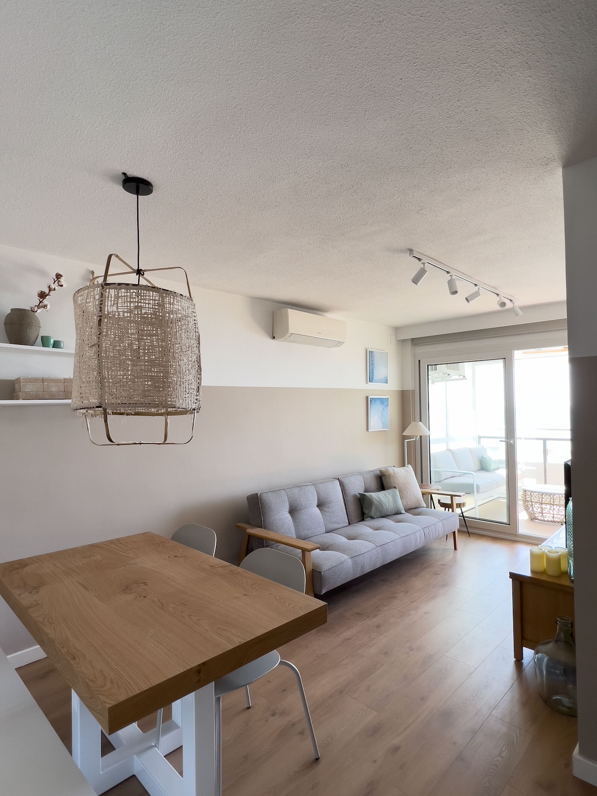 Apartamento de diseño completamente rehabilitado y decorado siguiendo el estilo mediterraneo. Ubicado el edificio Rodas, en pleno corazón de Salou y a primera linea de mar, cerca de todos los servicios, ideal para familias. Su valor diferencial son sus vistas al mar que se pueden disfrutar des de su terraza con mesa de comer y sofá , des del salón comedor y des del dormitorio principal. La terraza tiene una cortina de cristal para poder cerrarla si hace frío o mal tiempo.
