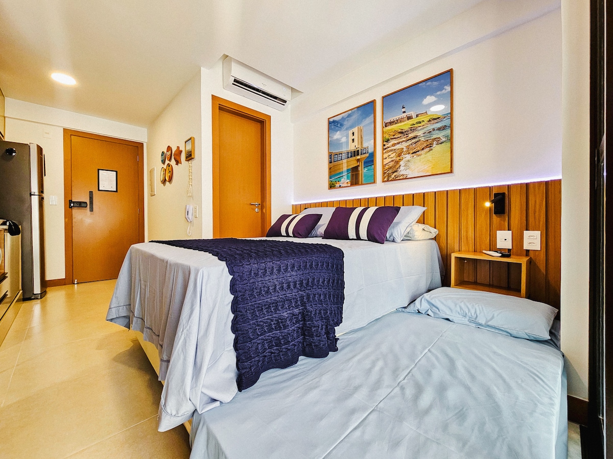Estudio en Barra, cerca de Praia do Porto, el más famoso de Salvador, Farol e Morro do Cristo. Cerca de bares, restaurantes y Shopping Barra, a pocos minutos del circuito de Carnaval Barra/Ondina. Tiene capacidad para 3 personas, con cama doble + cama auxiliar individual retráctil, aire acondicionado, Smart TV de 42" con suscripción a Netflix, wifi rápido y Alexa. Cocina equipada con ropa de cama completa. El edificio cuenta con garaje, piscina en la azotea, gimnasio, espacio de coworking, lavandería, minimercado y conserje las 24 horas.