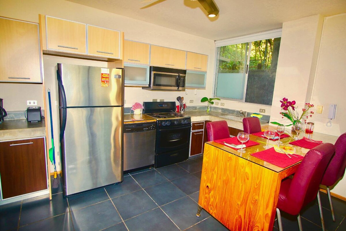 Modern 2-bedroom, 2-bath apartment in a peaceful jungle setting. Comfortably sleeps 5 plus a sofa bed in the living room for cozy movie nights. A/C and hot water in both bedrooms, full kitchen, and a stunning shared pool. Just 6 min to the supermarket, 12 min to Playa Pelada, 15 min to Guiones, 20 min to Ostional, 25 min to San Juanillo & Garza. Far from the crowds—ideal for rest and serenity after a day of surf or adventure. If you are lucky you can hear to hear the rooster and howler monkeys!