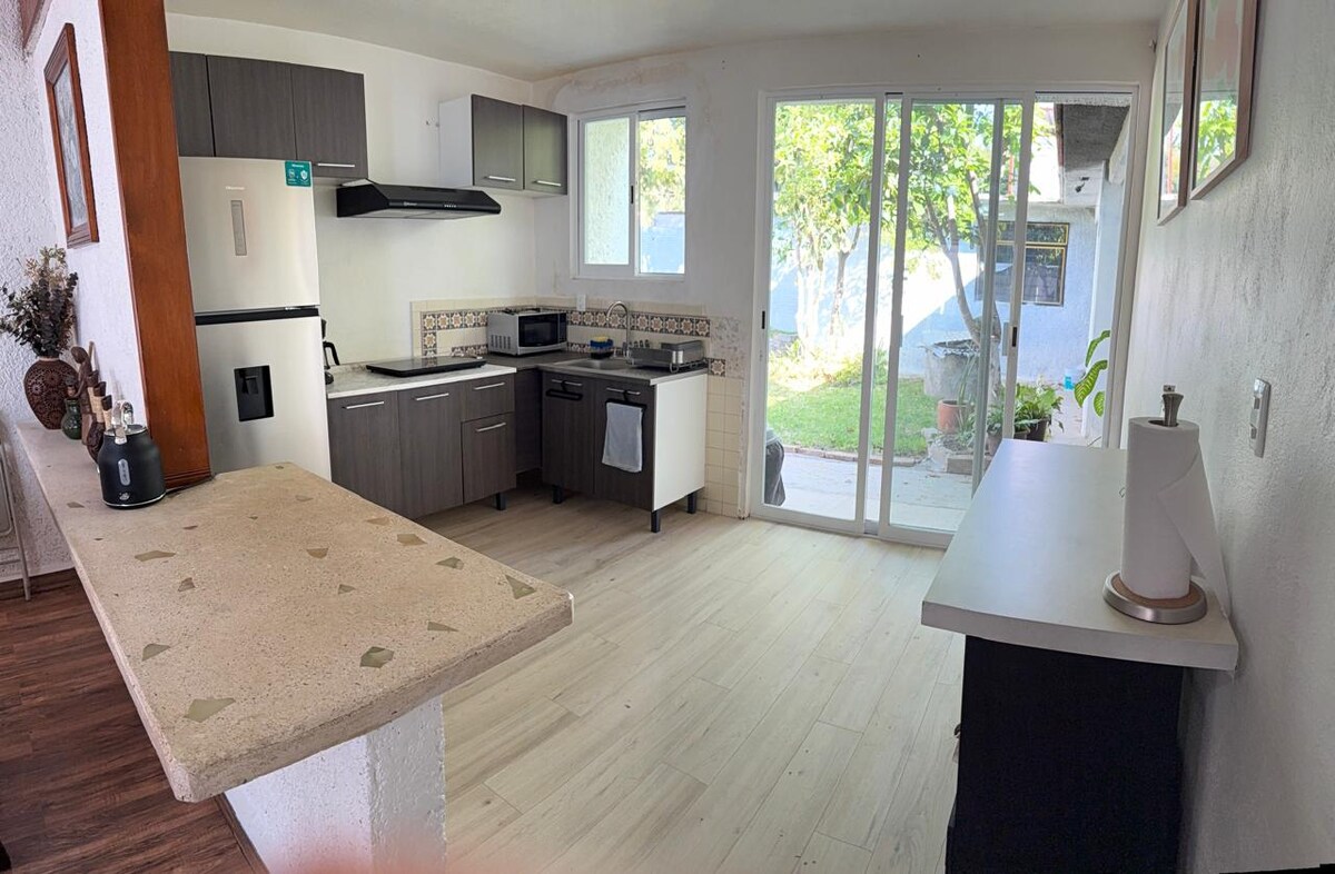 Excelente y tranquilo departamento al sur de la ciudad, a 10 minutos del Aeropuerto Internacional , a 20 minutos del centro histórico si traes auto y si usas transporte público es un poco mas de tiempo. Se encuentra a dos cuadras de la avenida principal, de tiendas de autoservicio y del mercado municipal. Cuenta con estacionamiento, caseta de vigilancia y está muy cerca de las vías que conectan con la ciudad sin todo el bullicio de la misma. Facturamos tu estancia. Bienvenidos ¡Te esperamos!