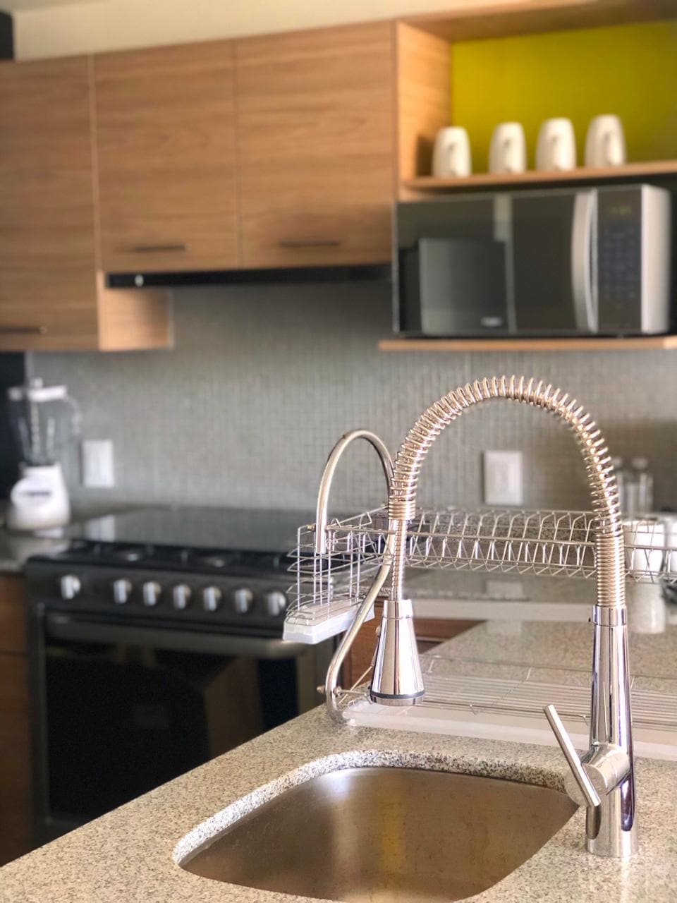 Lujoso y bonito apartamento con diseño art déco y muebles, relájate y disfruta de la vista porque está en un noveno piso, cuenta con comodidades como una pintoresca piscina, gimnasio, azotea panorámica, sala social, parrillas de barbacoa, seguridad y ascensores. El apartamento tiene una habitación con cama tamaño queen, un baño completo, lavandería, cocina completa, nevera con máquina de hielo y dispensador de agua fría. Ofrecemos 2 toallas para la ducha y 2 toallas para la alberca. También ofrecemos tours a la ciudad y pueblos mágicos.