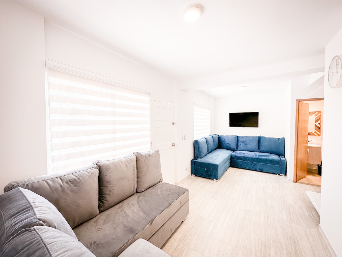 Apartamento de 50mts, en primer piso , cuenta con 2 amplias y confortables habitaciones y sala con aire acondicionado , sala comedor, cocina integral totalmente dotada, zona de lavado y 1 baño, con capacidad de hasta 7 personas distribuidas de la siguiente manera: una habitacion con 1 cama queen (2 personas), tv (nacional y netflix), otra habitación con 1 cama doble y 1 cama nido sencilla (3 personas), closet y tv (nacional y metflix), y en la sala se cuenta con un sofa cama (2 personas)