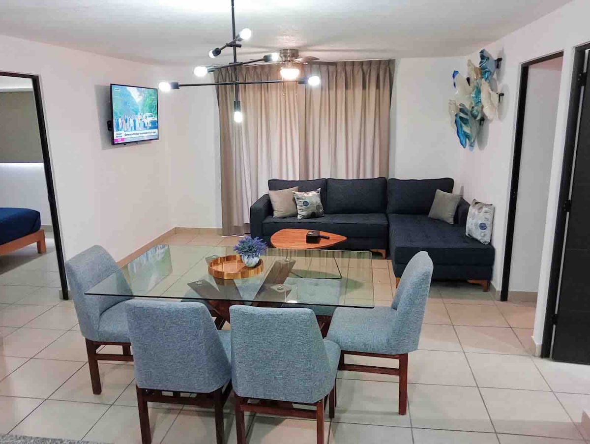 ¡Bienvenidos a nuestro nuevo departamento, ideal para hasta 6 personas! Cuenta con dos habitaciones bien equipadas, una cocina completa y una sala de estar acogedora donde podrás relajarte después de un día explorando la ciudad. Además, dispondrás de una cochera privada para carro mediano. Ya sea que viajes por trabajo o por placer, este espacio nuevo te ofrece el balance perfecto entre estilo, ubicación y comodidad. ¡Esperamos que disfrutes tu estadía!