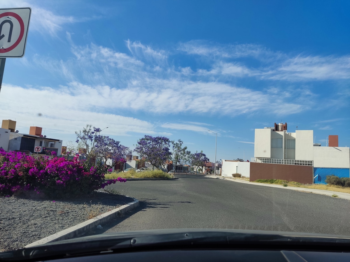 Hermosa casa con dos habitaciones, sala comedor, cocina, baño, patio de servicio, lavadora, refrigerador, horno de microondas y diversos muebles. Agua caliente y wifi, extensa colección de películas originales para disfrutar en el cuarto principal. Zona segura, fraccionamiento con ambiente familiar y zona común de juegos (ver fotos). Bancos y plazas comerciales a 5 min y vialidades estratégicas para juriquilla y ciudad de Mexico. Mi esposa mi hija y yo vivimos en la casa de al lado (oyamel 141, ver fotos) y esto permite una comunicación cercana brindando a ustedes también su propio espacio, esta cercanía permite ayudarlos con alguna sugerencia para conocer esta bella ciudad o alguna idea así como algo que pudiesen necesitar al momento.