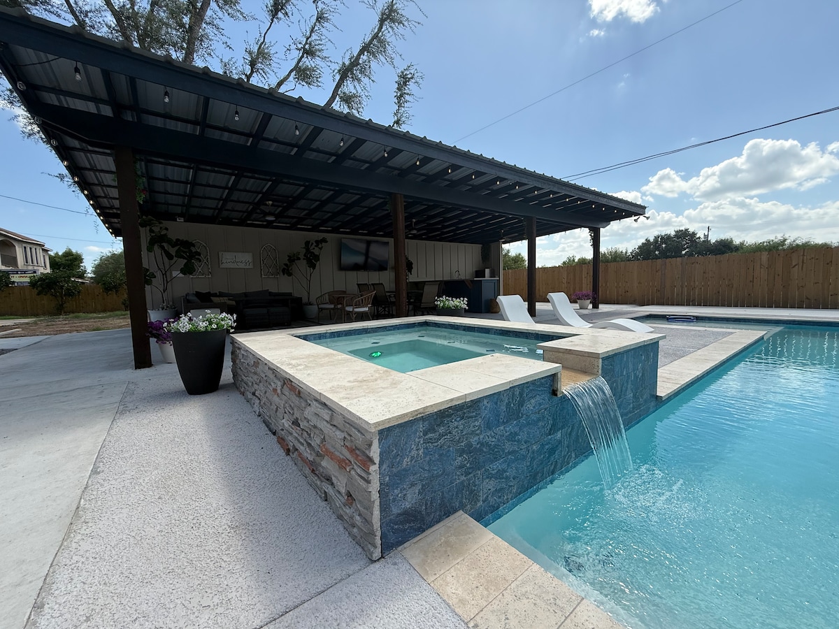 Piscina privada ¡Recientemente remodelado y amueblado, listo para que su estancia sea lo más cómoda y práctica posible! ¡Justo al salir de la autopista, frente al centro comercial outlet (a 3 minutos en auto), a 20 minutos de McAllen y a 40 minutos de South Padre Island! A 5 minutos del recinto ferial. ¡La casa se encuentra en un terreno de 1/2 acre (0,2 hectáreas) en un vecindario tranquilo y apacible! 2 camas tamaño queen 2 camas individuales Sofá plegable
