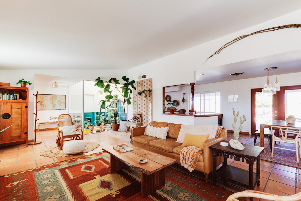 Suncatcher House ofrece vistas panorámicas al Parque Nacional y a un rancho de caballos distante. La casa cuenta con dos suites principales, una espaciosa tercera cama + baño y un cómodo sofá cama en la sala de estar. El diseño permite una gran privacidad entre los huéspedes. Relájate en el exterior en la bañera de vaquero o en las hamacas mientras admiras las vistas del parque al atardecer. Cuando cae la noche, acércate al fuego bajo las estrellas o sumérgete en la bañera con patas después de una larga caminata. Sensación de aislamiento a solo unos minutos de toda la mejor acción de la ciudad, como Tiny Pony, Frontier Cafe. ¡A los huéspedes les encanta nuestra ubicación y las vistas te dejan recargado y relajado! Suncatcher es un lugar para relajarse y divertirse bajo los alegres rayos del sol de Mojave. Experimenta un viaje íntimo para dos o disfruta con un grupo en las cuatro áreas para dormir separadas. Disfruta de las impresionantes vistas del desierto desde el patio trasero privado mientras chapoteas en la bañera de vaquero, te reúnes alrededor de la hoguera o te balanceas en una hamaca. Salimos y usamos la casa nosotros mismos a menudo, por lo que hemos equipado la casa con mucho amor y comodidades para cocinar. Tenemos una biblioteca de juegos y libros para que disfrutes durante tu estancia. Creemos que el desierto es el lugar perfecto para una desintoxicación digital ;) ¡Acceso a la casa y patio trasero privado con bañera de vaquero! Nuestro administrador de la propiedad está cerca y listo para ayudarte :) La casa se encuentra entre la entrada del Parque Nacional Joshua Tree y Pappy & Harriet's en la cercana Pioneertown, a 10 minutos en coche de cualquiera de los dos lugares. Hay un mercado al final de la calle, así como un estudio de yoga, cafeterías y adorables tiendas de antigüedades. La mejor manera de desplazarte es en coche. Tanto Uber como Lyft dan servicio a la casa, ya que está en una carretera pavimentada, por lo que si estás planeando ir de fiesta a The JT Saloon o Pappy's Ride Share, seguirá siendo una opción para volver a la casa. Tenemos cámaras de seguridad en las entradas de la casa. Puedes tener reuniones familiares y de amigos en el espacio, pero trátalo con cuidado: es un lugar especial para nosotros que usamos a menudo y no es solo un hotel para nosotros.