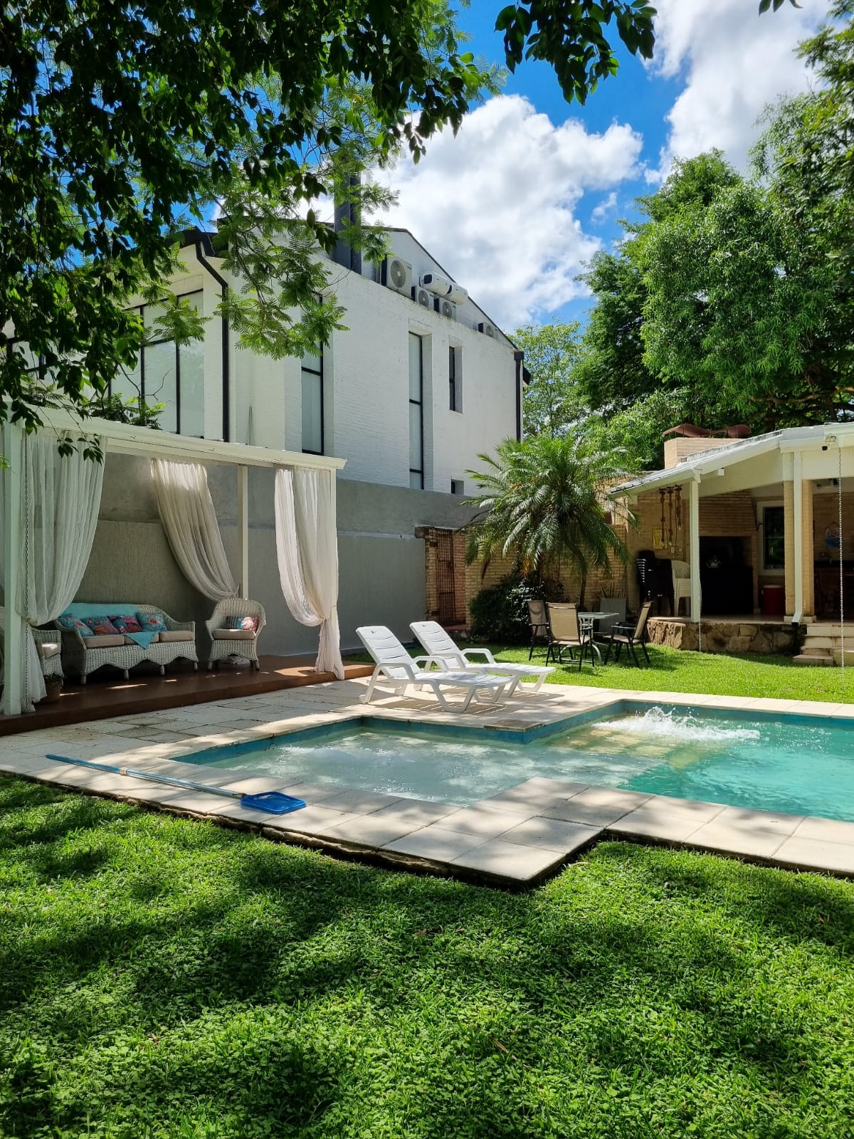 Acogedora suite rodeada de frondosos árboles, pileta y parrilla, ubicada en zona del Anfiteatro a pasos de supermercados, restaurants, bares y lugares turísticos para disfrutar de lo mejor de Sanber! Cuenta con todas las comodidades para descansar, cocinar, trabajar y pasar un buen rato. El lugar nace de la visión de conjugar una vivienda de estilo ecológico con un entorno muy natural, con árboles nativos de gran porte y varias especies de aves que frecuentan el lugar.