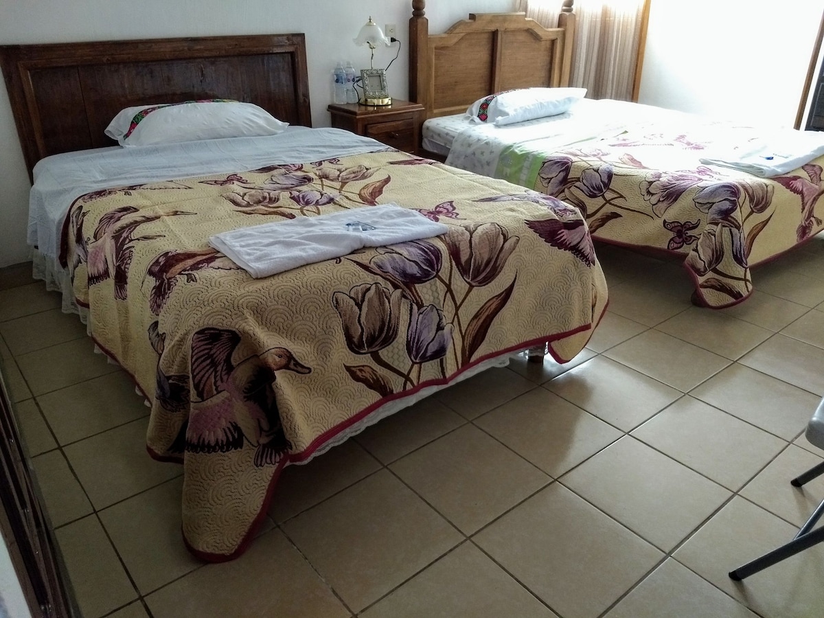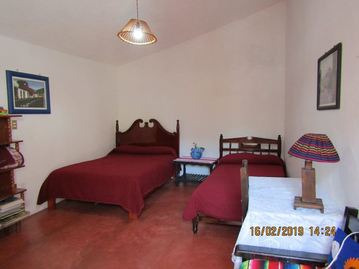 La casa se ubica al norte de la ciudad, a 20 min. a pie del centro y a 15 min. del mercado y cuenta con buena disponibilidad de transporte público (taxis pasan cada 5 min. y colectivos cada 10). Es una zona tranquila y con servicios diversos como lavandería, lugares para comer, mini super, farmacia, panadería y se encuentra a 10 min. del Museo Na Bolom. El cuarto es amplio, cómodo y es ideal para parejas, grupos de 3 personas, o familias con un hijo que pueda dormir en una cama individual.