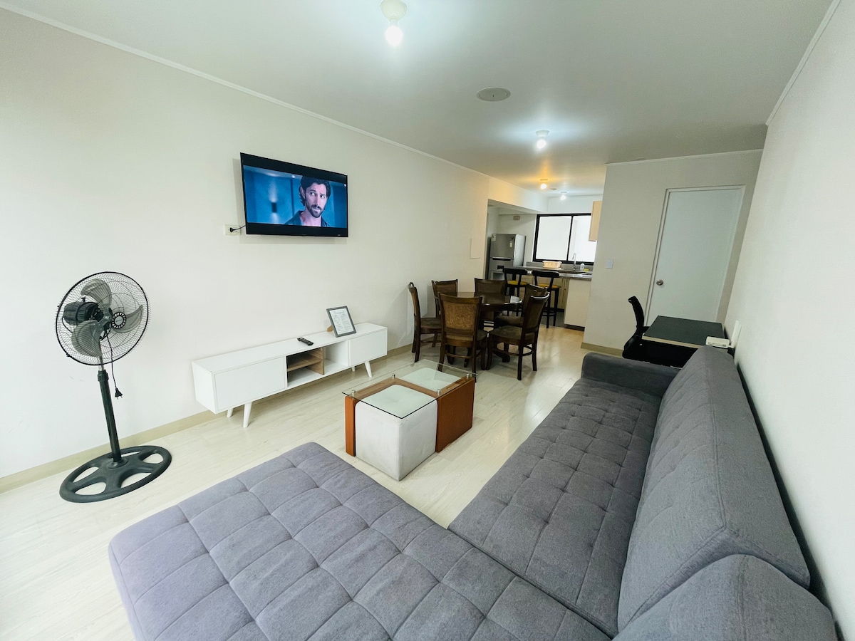 Departamento súper bien ubicado en Surquillo, cerca a distritos como Miraflores, San Isidro, San Borja y Surco, cerca a centros comerciales y avenidas grandes, ideal para familias ya que cuenta con 1 dormitorio con TV de 55" con cama queen, sofá cama, baño completo, Kitchenette, sala con TV de 86", y todo lo necesario para una buena estadía, piso 10. Cuenta con zona común de parrillas, sala de billas, gimnasio, cine, lavandería industrial, zona de parrillas (previo pago).